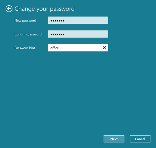 Then the wizard asks you to enter a new password, twice, along with a hint for the new password. Please enter the same and click on Next.