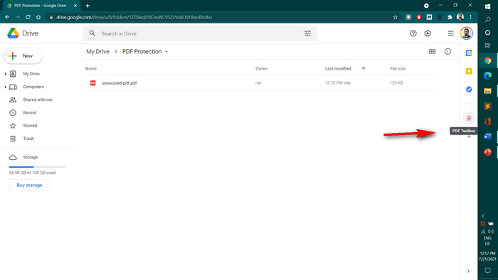 Now, locate the unprotected PDF file from Google Drive. If it is on a local hard drive of computer, then upload it to Google Drive. Then click on the newly added PDF Toolbox button on the right.